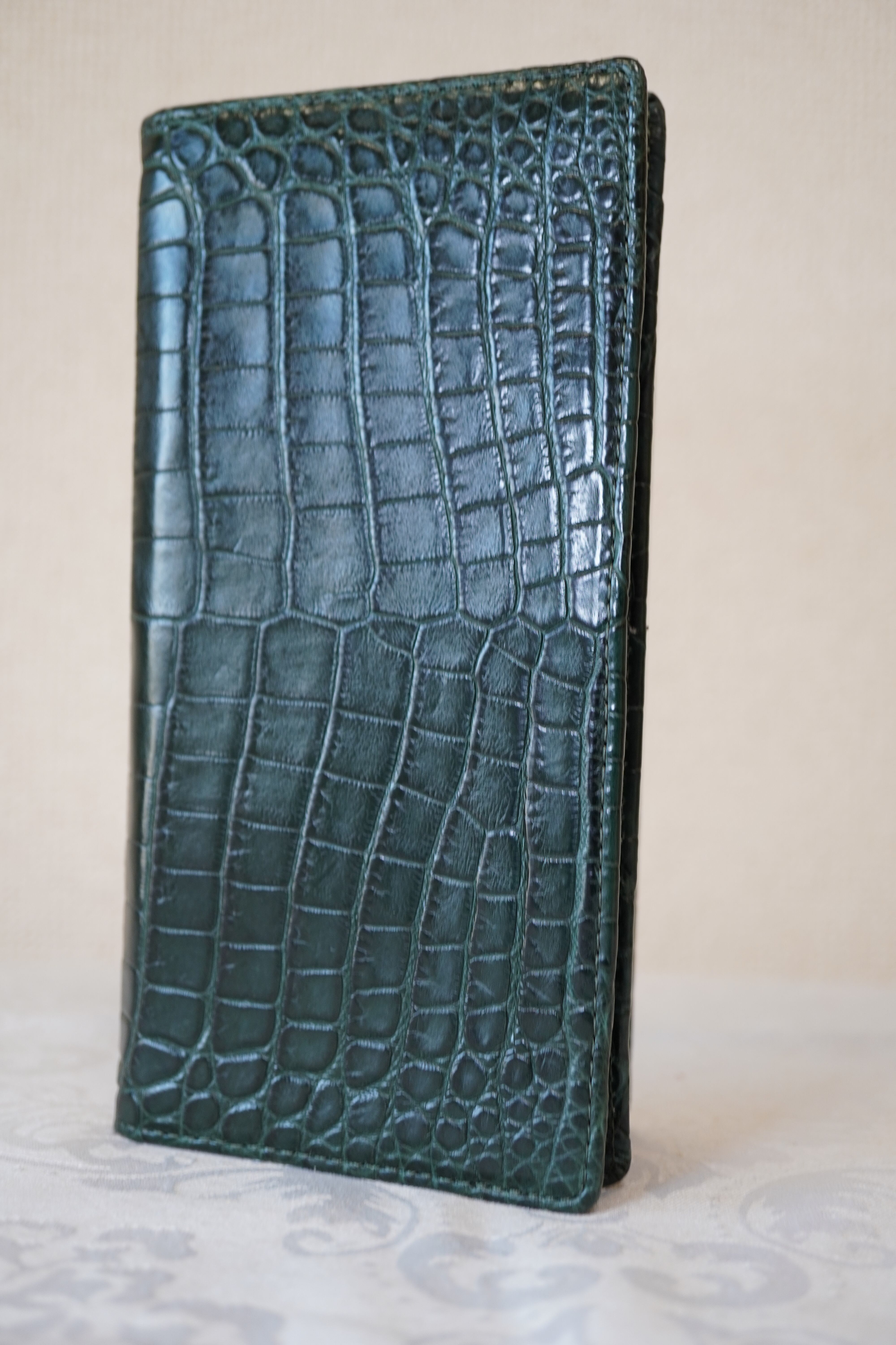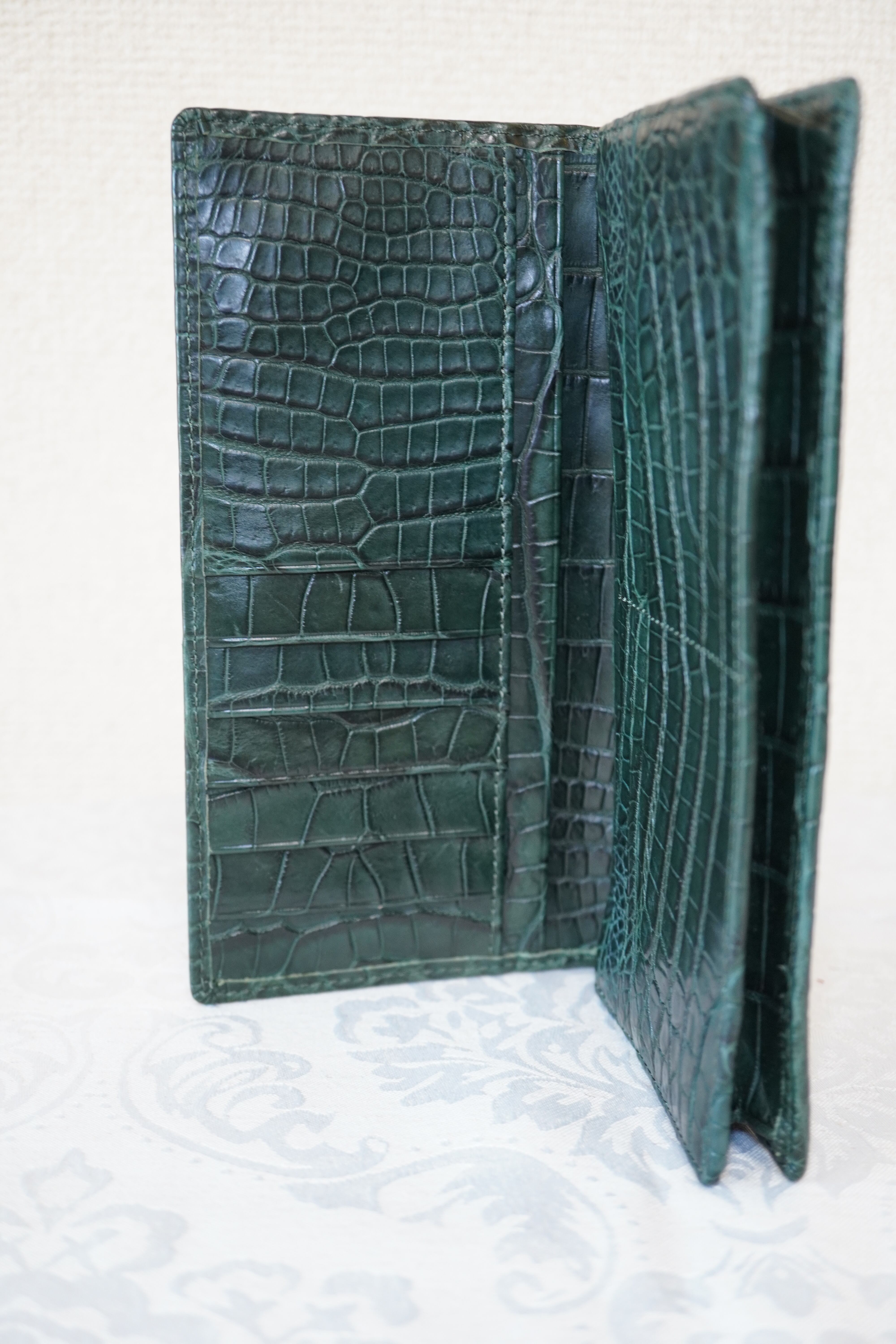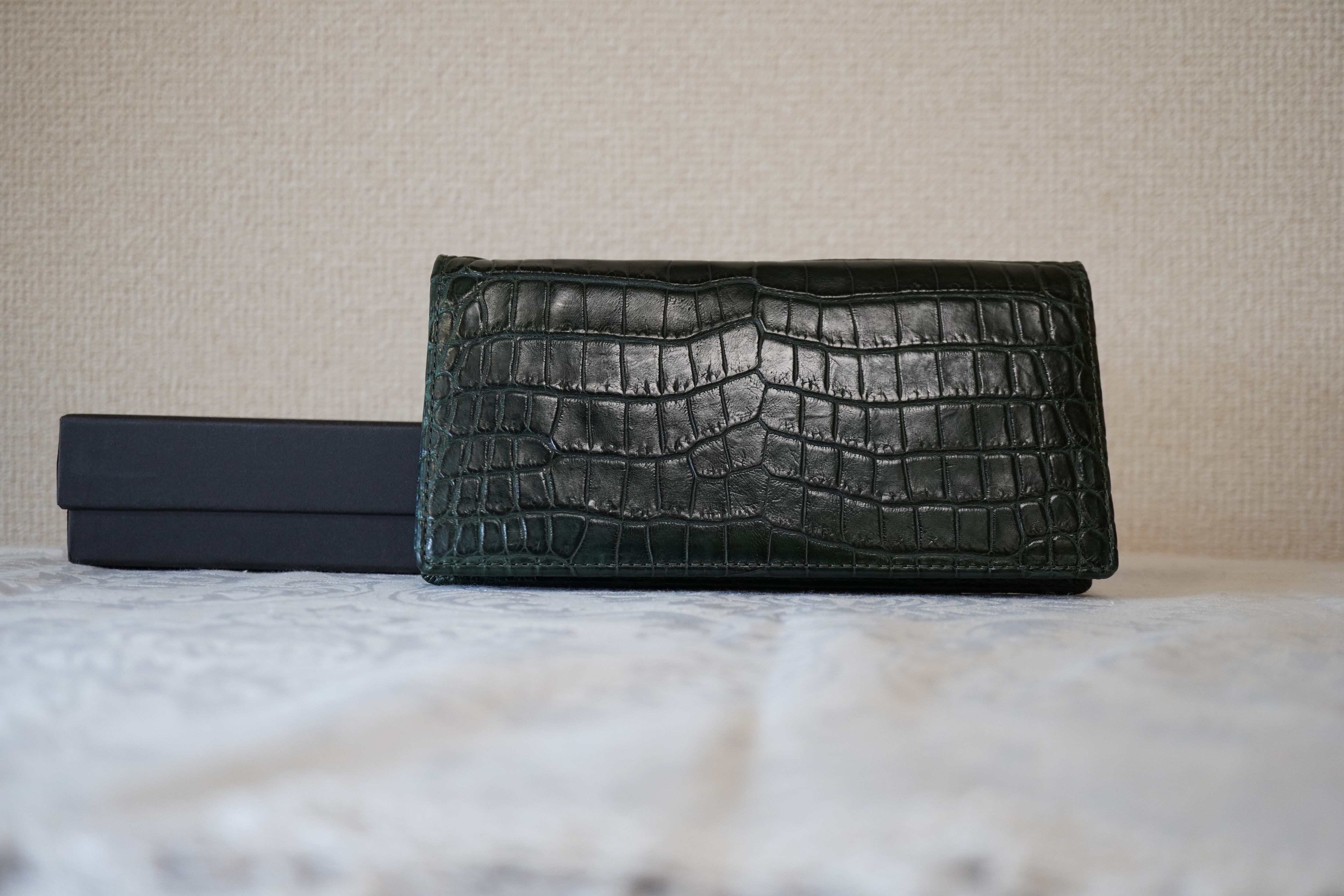 マットクロコ 長財布(キブロス・モスグリーン) 深みのあるモスグリーンが魅力の長財布。 カードや札入れを備え、日常使いに最適。落ち着いた色味で男女問わずお使いいただけます。 サイズ:9.5×18.5×2 cm 素材:クロコダイル(キブロス仕上げ) 仕様:カード入れ・札入れ 価格:¥142,000